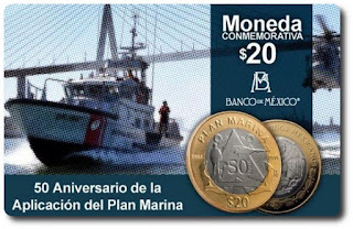 The Bank of Mexico announces the putting into circulation of a coin of 20 pesos (0.86 euros) of bimetallic type, to commemorate the 50th Anniversary of the Implementation of the Marine Plan (1966-2016), whose mission is to assist the population in cases and zones of emergency or disaster. This important task also covers the international sphere, through humanitarian aid that is sent to various countries affected by disasters.